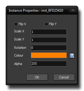 - Instance Properties: Clicking this will open a further window where you can set some of the basic start properties for the instance, like blend colour, image angle, scale and alpha.