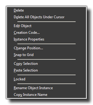 - Paste Selection: This will paste the instance (or instances) currently on the clipboard, and this can even be used in a different room so that you may copy instances from one room to another.