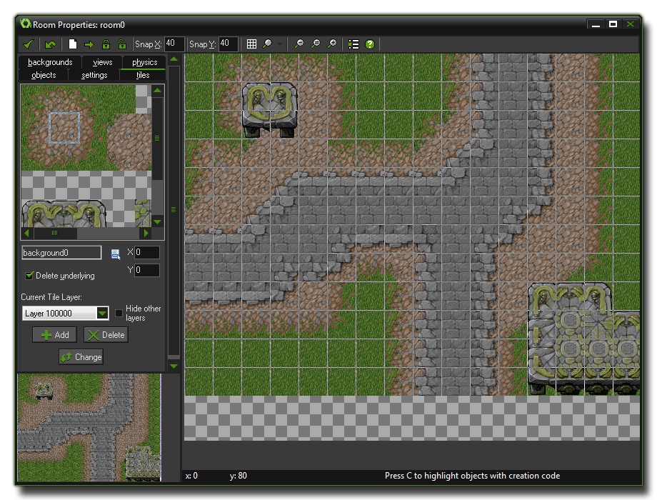 - Delete All: This will delete all tiles found at this position in the room (at the same depth).