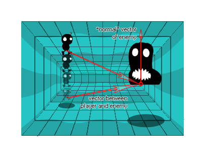 Basically, we are getting the vector normal from the enemy perpendicular to the floor and then we are getting the vector of the player to the enemy. We will then get the dot_product of these vectors, and if the result is positive the player is "above" the enemy floor plane and if it is negative he is below. The actual code to get this working is supplied in the example below.